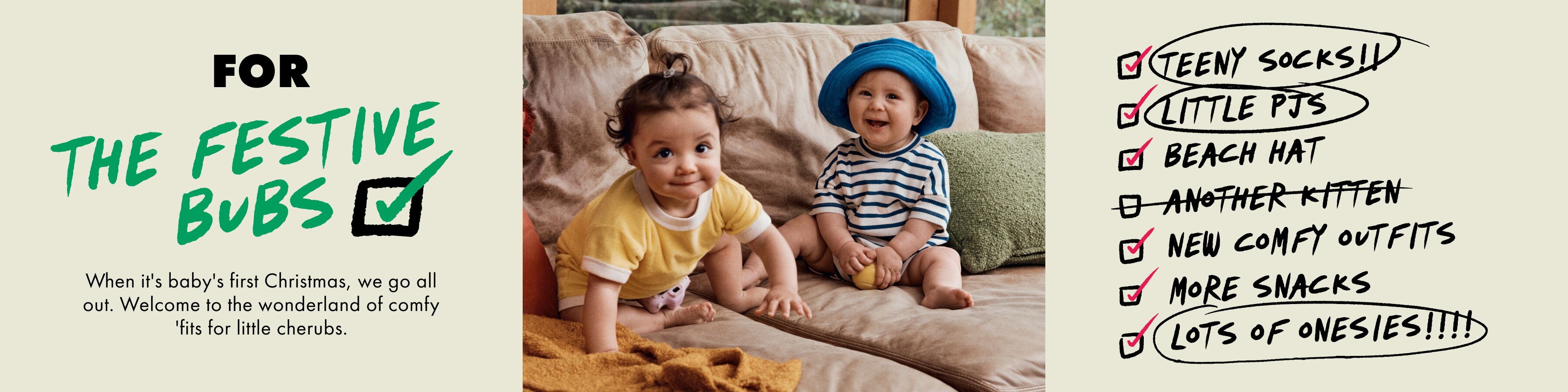 Christmas gifts for bubs? We got 'em! From pre-Christmas matching outfits to classic Zippys, our wonderland has Christmas gift ideas for babies from newborn and above. Whether it's a tutu dress, a Christmas onesie or tiny stocking stuffers, your Christmas present gift ideas are sorted with our festive drop. Match with your teeny angel in our limited-edition prints or pop some away for your christmas presents stash; you do you! With budget-friendly Christmas present ideas, Secret Santa gifts, stocking fillers and more - we're here to untangle your holiday season. Shop Christmas Gifts at Bonds!